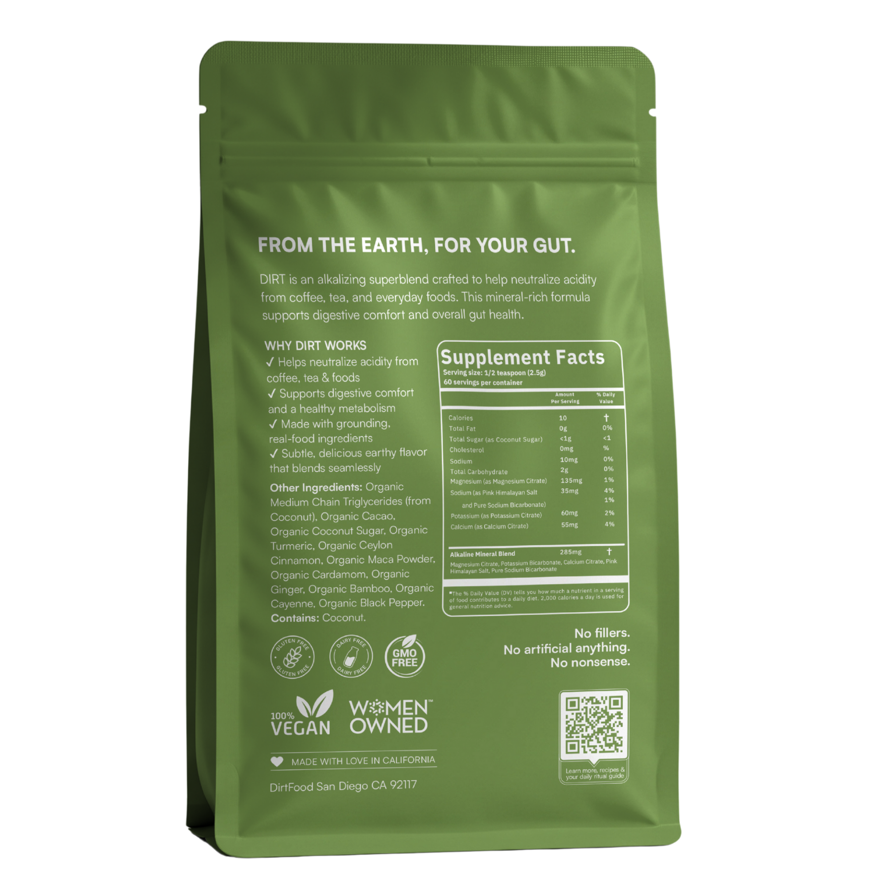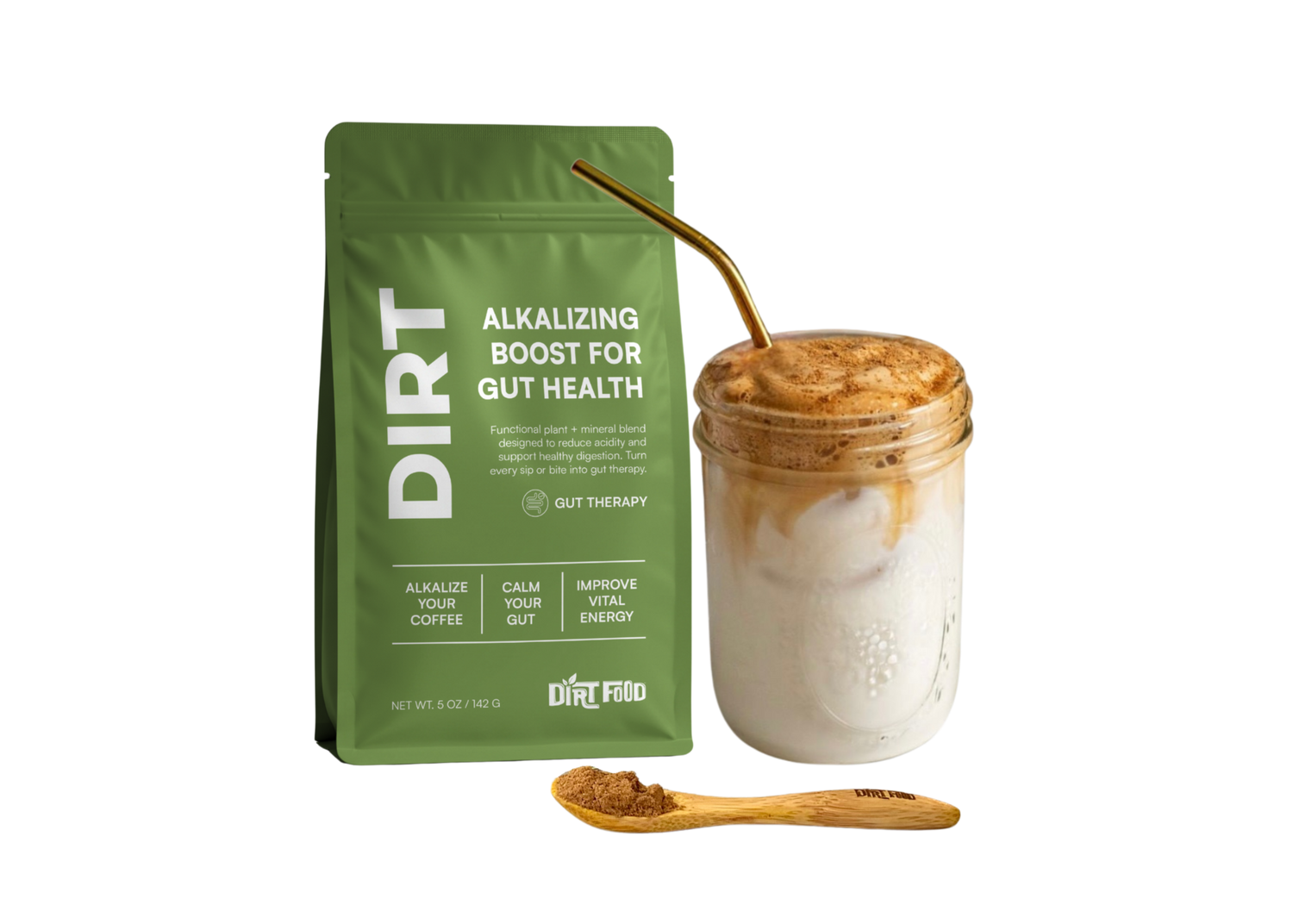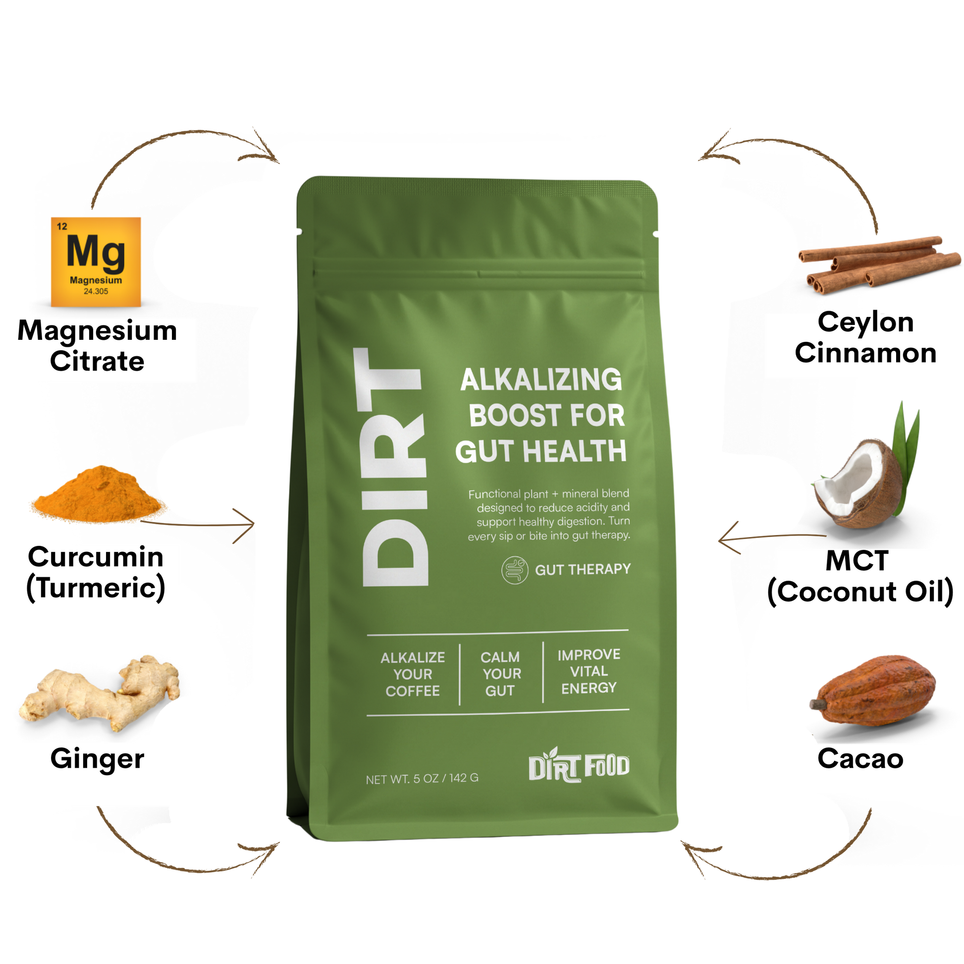 Alkalizing Dirt Spice is a nutraceutical additive for coffee, designed to convert it from acidic to alkaline, while also boosting gut health and eliminating acid reflux, heart burn and indigestion. Containing 135mg Magnesium Citrate as well as the most bioavailable superfood and mineral compounds, it was created to keep coffee in the life of our founder who was battling cancer and needed to eliminate the intake of acid from her diet. Absolutely delicious in coffee/tea, baked goods, overnight oats, yogurt and spaghetti sauce to eliminate the acidity of tomatoes